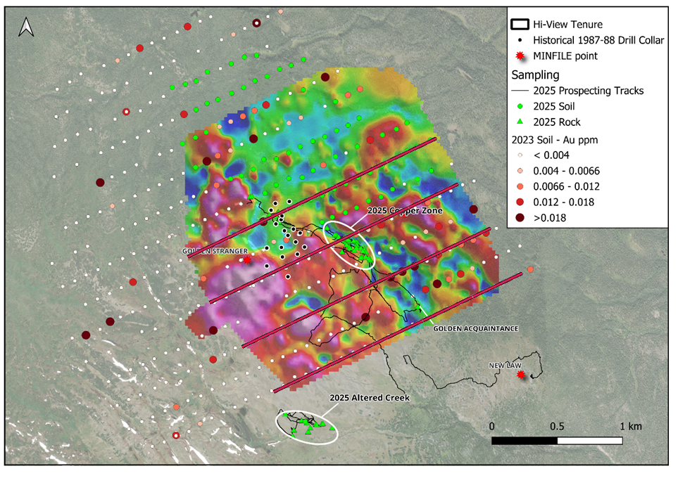 The 2,669-hectare Golden Stranger Property is Hi-View Resources’ flagship project in BC’s Toodoggone District, hosting multiple epithermal gold-silver zones with strong alteration and historic drilling. Past work outlined a pre-NI 43-101 estimate of 498,905 tonnes grading 2.74 g/t gold, while recent sampling returned up to 111.5 g/t gold, 2,740 g/t silver, and identified a new copper zone over 250 metres by 100 metres. A 2-kilometre magnetic low links the Golden Stranger and Golden Acquaintance zones, defining a clear trend for follow-up work and near-term drill targeting.
