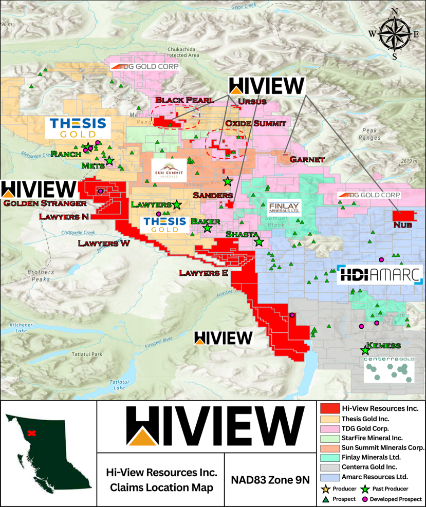 Hi-View Resources Inc. is a mineral exploration company targeting gold, silver, and copper in the Toodoggone region of northern British Columbia, Canada. Its 100% owned properties span over 18,855 hectares, including the Golden Stranger Project, the Lawyers North, West, and East Projects, and the Borealis Project. Additionally, the Company has under option the Saunders and Nub properties (1,083.5 hectares) and Black Pearl, Oxide Summit, Urus, and Garnet Properties (1,912.46 hectares). The Golden Stranger project is fully permitted with 45 drill-ready sites. Historical drilling highlights include 10 meters at 11.55 g/t gold, a historical resource estimate, sampling yielding up to 111.5 g/t gold and 2,740 g/t silver, with new mineralized zones identified 1.3 km from the main showings, indicating significant exploration potential. For further details, visit the Company’s website or recent filings on SEDAR+ at www.sedarplus.ca.