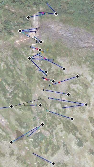 • Structural analysis confirmed two dominant joint and vein orientations, north mapping northwest with secondary west-northwest structures. The orientations