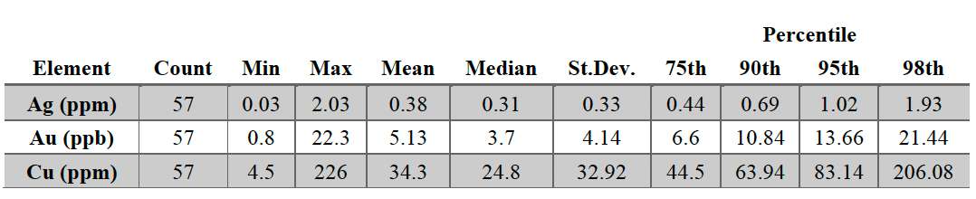 Geological mapping, prospecting and contour soil sampling. Most exploration efforts focused west of current claim boundary. Northwest Breccia zone rock sample returned 3.45 g/t Au and 190.9 g/t Ag. Up to 12.87 g/t Au from Jo Zone.